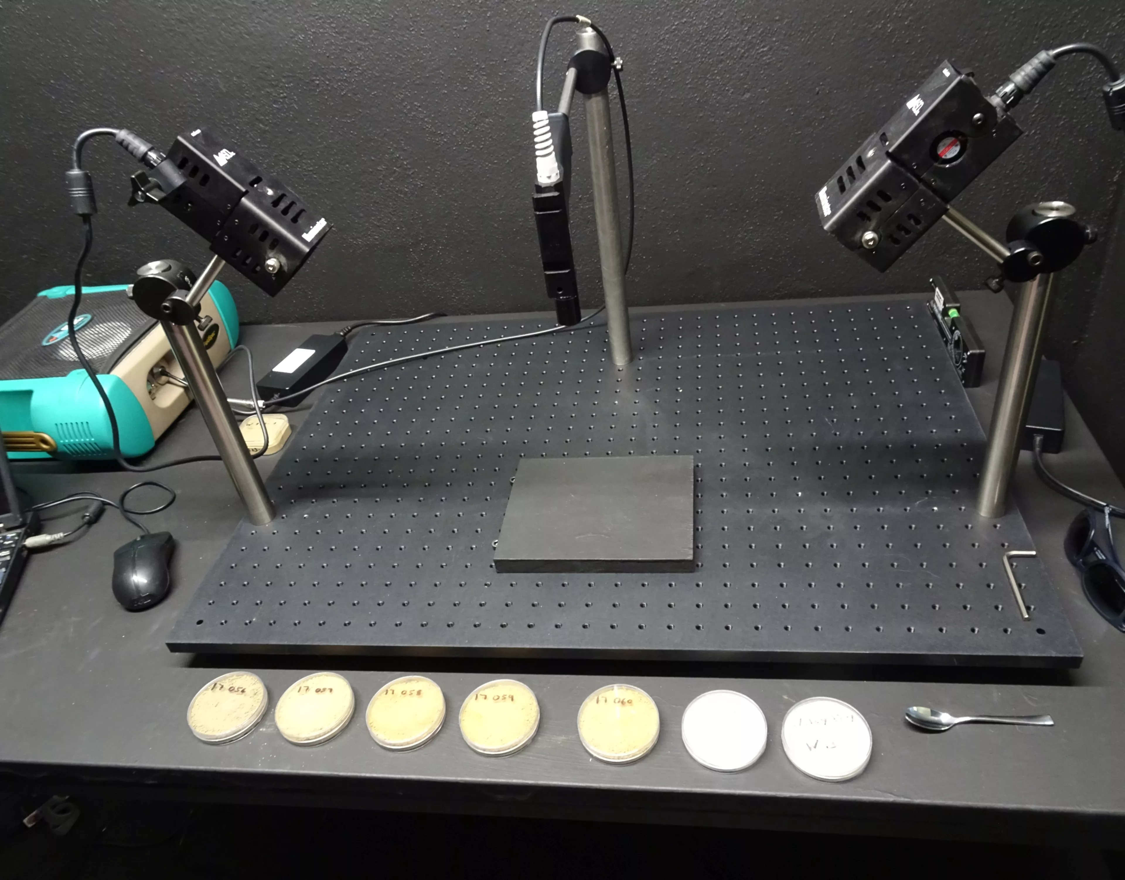 In einer Dunkelkammer sind auf einem Tisch drei Messgeräte auf das Zentrum einer dunklen Platte gerichtet. Davor stehen Schälchen mit verschiedenen Bodenproben.