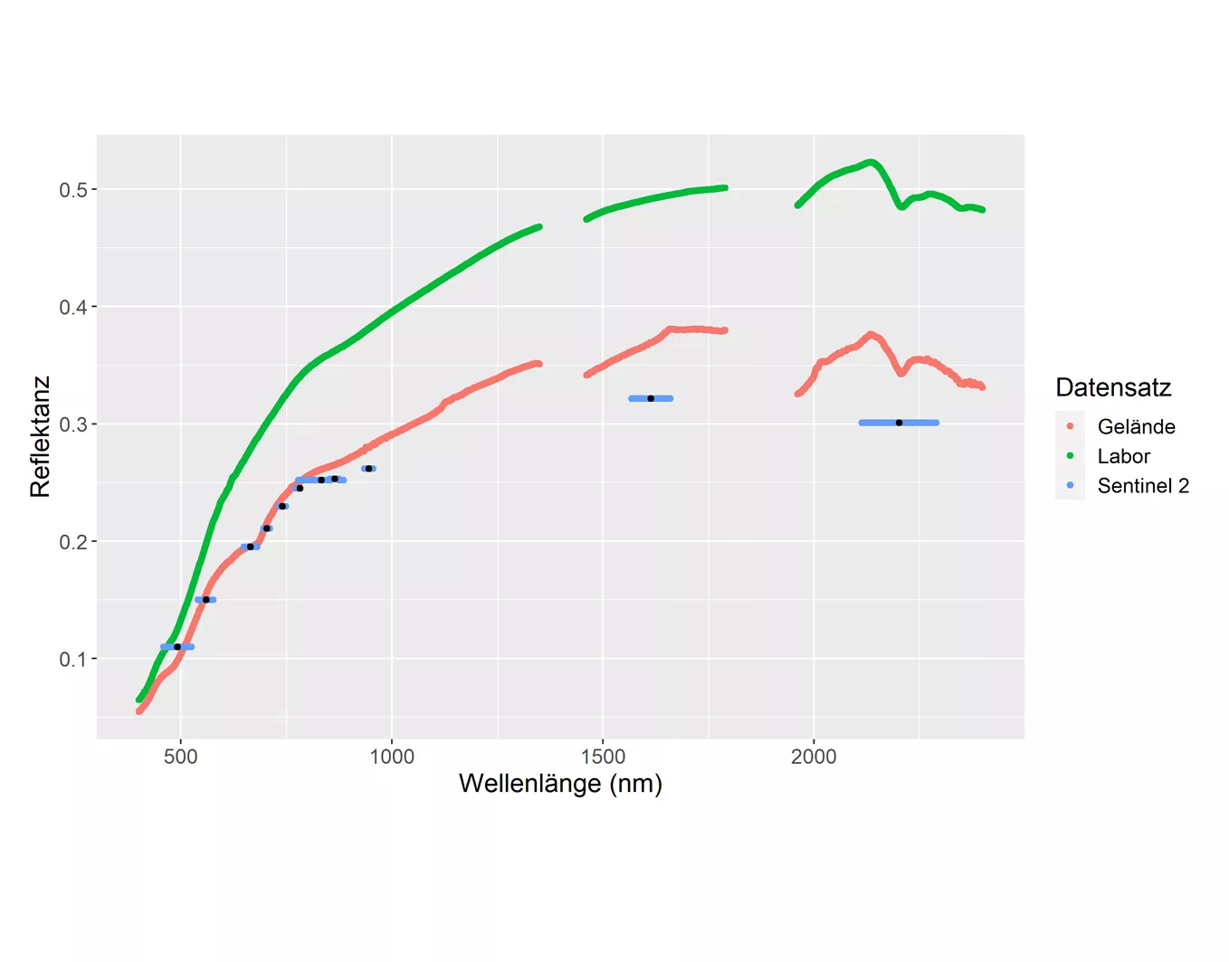 Beispiel-Spektren für einen Standort aus Hyperspektralmessungen im Gelände (rot), Labor (grün) und abgeleitet aus multispektralen Sentinel-2-Aufnahmen (blau)